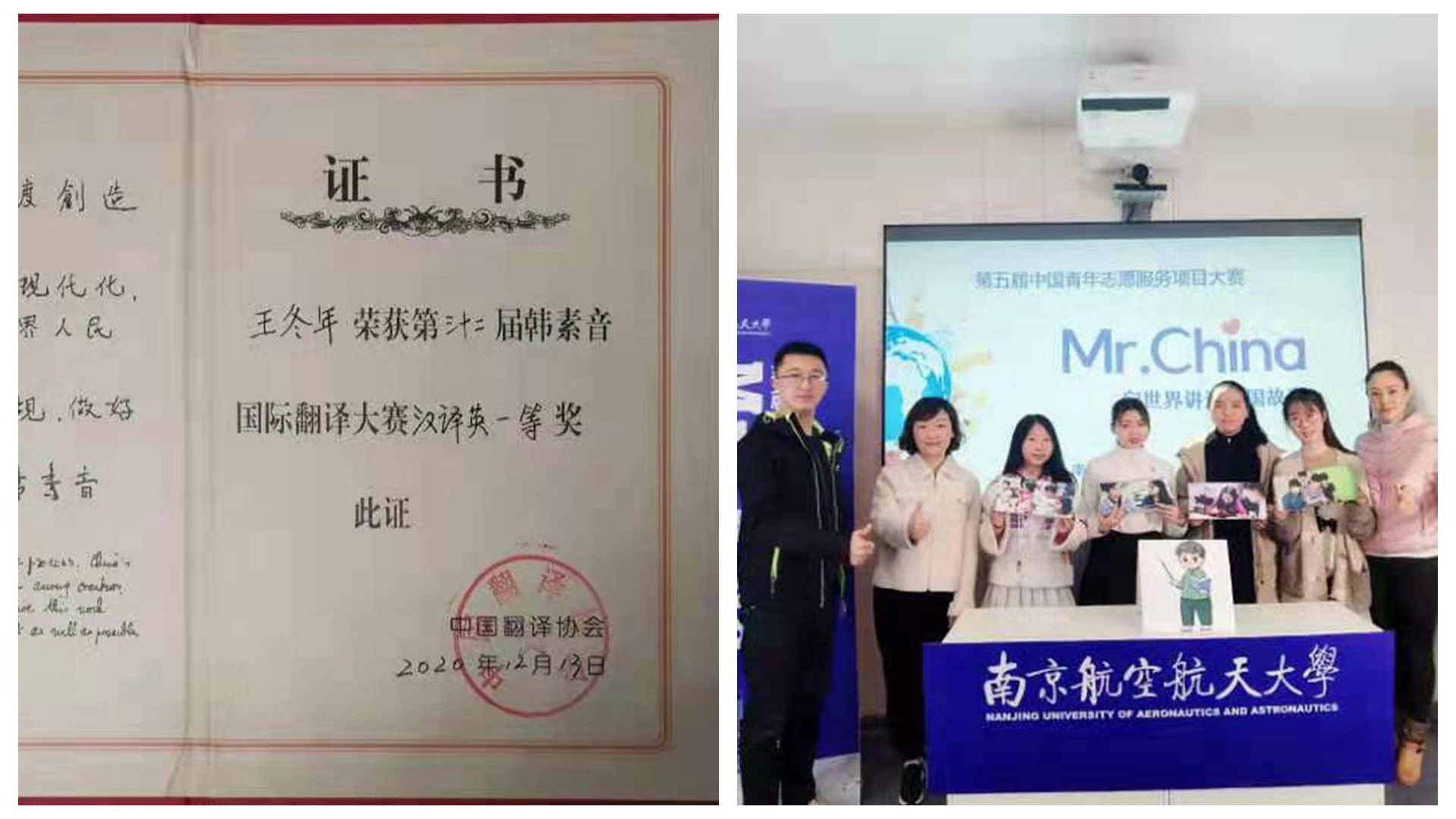 人才培养质量实现新提升。2018年,根据学校部署,开展学院教育思想大讨论,明确了“为学校提供优质外语教学支撑,为国家输送具有国际视野的优秀专业人才”的人才培养目标。完善构建宽口径人才培养体系,英日语专业重构课程体系,开办英语专业辅修专业。2017年,完成学位点自评工作,并在第四轮学科评估中获得C+结果。多举措提升研究生招生规模与生源质量。推进校企协同育人,获批教育部产学协同育人项目1项,江苏省研究生工作站1个,与世界500强大唐公司合作举办高级研修班。实施外语人才“创新能力提升工程”,助力科创竞赛实现突破。“Mr. China:向世界讲述中国故事”实践团队,2019年获首届“力行杯”江苏省大学生社会实践项目大赛二等奖、2020年获江苏省志愿服务项目大赛一等奖、全国银奖。实施“外语人才素质能力提升工程”,助力高水平竞赛获奖等级持续攀升。2020年韩素音国际翻译大赛,我院学生荣获一等奖。纽约国际模拟联合国大会大赛,连续多年获得团体奖,个人立场文件奖合计11项。“外研社杯”阅读、演讲、写作系列英语大赛,我院学生连续多年斩获多项大奖。学院连续两年学风建设问卷调查满意度位列全校第一,连续两年荣获学校“学风建设工作特色奖”。关爱学生成长,实施“本科生学业攀登计划”,帮助学困生进步;英语专业优秀学生助力北京冬奥申请,获得赴联合国总部实习机会。杰出校友反哺,校友感念学院和班主任,设立“茗扬开拓者奖学金”,奖励具有协作、创新精神的在校生。