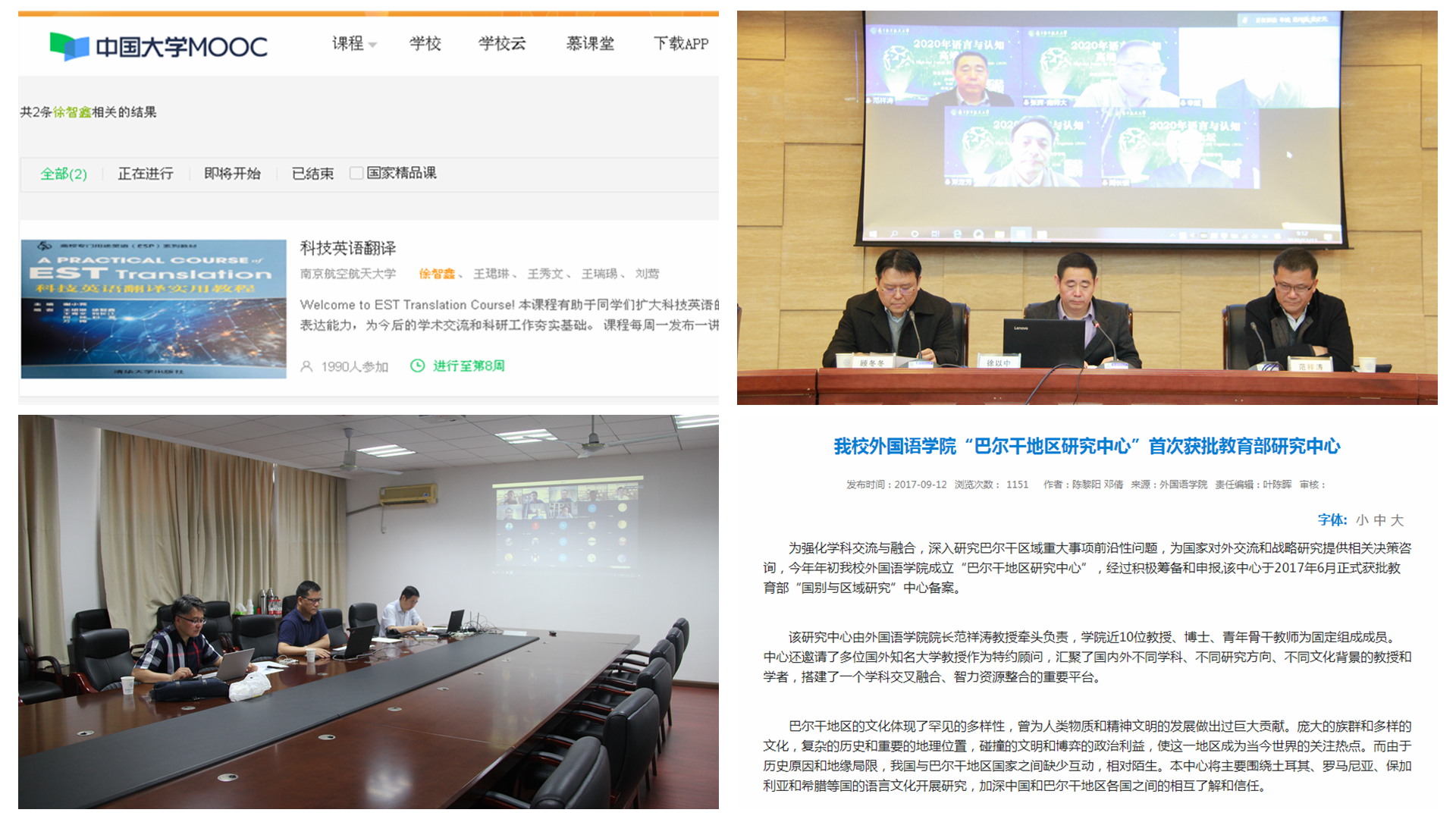 专业学科建设实现新突破。专业建设和学科建设是人才培养、科学研究和社会服务的两大支柱,学院不断深化内涵,特色建设,改革创新。专业学科创一流:学院英语专业2016年获批“江苏省重点专业”,2020年成功申报“国家一流专业”;2020年,筹备外国语言文学一级学科新一轮评估。研究机构强特色:近五年,新建2个研究中心;2017年获批教育部国别和区域研究中心,重点开展巴尔干地区研究;成立“航空英语研究中心”,2017年与无国界航空发展有限公司探索产教融合;2018年为东航构建维修人员英语能力测评体系。实验室建设增实效:近五年,新建成2个实验室;2018年新建国际会议同声传译实验室;2019年建成神经认知语言学实验室。专业会议促交流:每年举办全国或省内的学术、教学会议2场;2020年主办了“全国国别与区域研究云上高端论坛”,并成功举办翻译学、文学、语言认知学三个全国性线上学术会议。