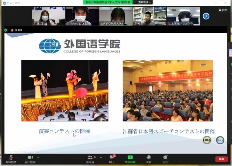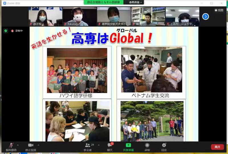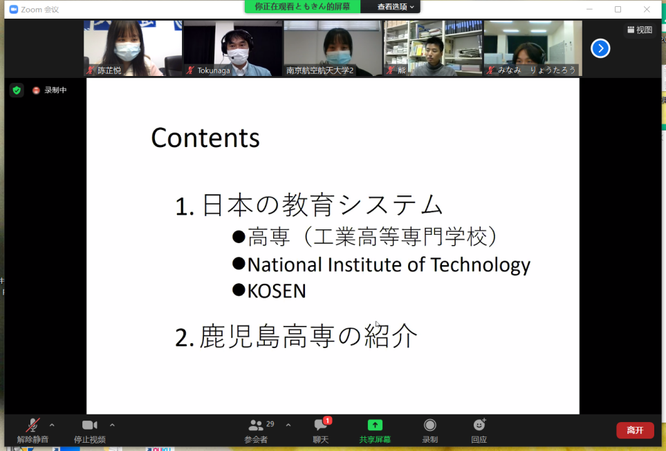 交流会以Zoom在线形式开启,全程使用日语。永利集团88304官网日语系主任窦硕华老师、副主任钟勇老师、人文学院法律系洪骥老师(本校日语系毕业)、日语系研究生、本科生共计12名同学及鹿儿岛高专2名老师、13名同学参加了交流会。