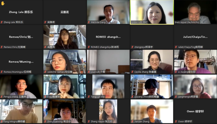 本次讲座由永利集团88304官网刘世红副教授主持。在讲座的上半场,Irwin Appel教授诠释了西方最伟大的戏剧家莎士比亚创作的思想内涵和艺术价值,展示丰富多彩的戏剧舞台演绎手法和理念,解读《罗密欧与朱丽叶》中爱情故事的深层意义。在讲座中精心穿插多种有趣的互动环节,引导观众领略莎翁戏剧的语言特色和艺术魅力。下半场的讲座中,多位学生演员表演《罗密欧与朱丽叶》经典对白,表演生动精彩,获得Irwin Appel教授及与观众的高度赞扬,Irwin Appel并给予悉心指导。在讲座最后的问答环节中,同学们纷纷在聊天室打字、以及开麦出镜提问, Irwin Appel教授一一答疑解惑,将讲座气氛引入高潮。