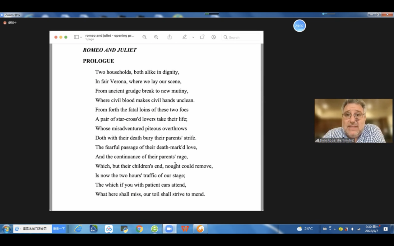 2022年5月7日上午,由永利集团88304官网主办,邀请美国著名导演、加州大学圣芭芭拉分校戏剧与舞蹈系主任Irwin Appel教授为永利官网师生讲解莎翁戏剧,这是该教授在本学期第二次讲授戏剧专题。此次讲座的主题为“莎士比亚戏剧在南京:《罗密欧与朱丽叶》赏析”,为永利集团88304官网举办的“海外名家讲坛”系列讲座之一。永利官网师生们对莎翁戏剧热情不减,积极参与,气氛热烈融洽,讲座获得圆满成功。